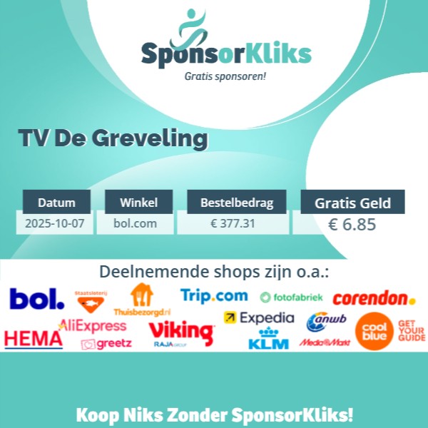 Bovenstaande transactie bij bol.com via sponsorkliks levert onze verening € 6,85 gratis sponsorgeld op. De opbrengst dit jaar is inmiddels € 35,05 maar dat kan natuurlijk veel meer worden als alle leden hun bestellingen op internet via sponsorkliks laten lopen. Het kost jezelf niets, maar kan de vereniging veel geld opleveren.