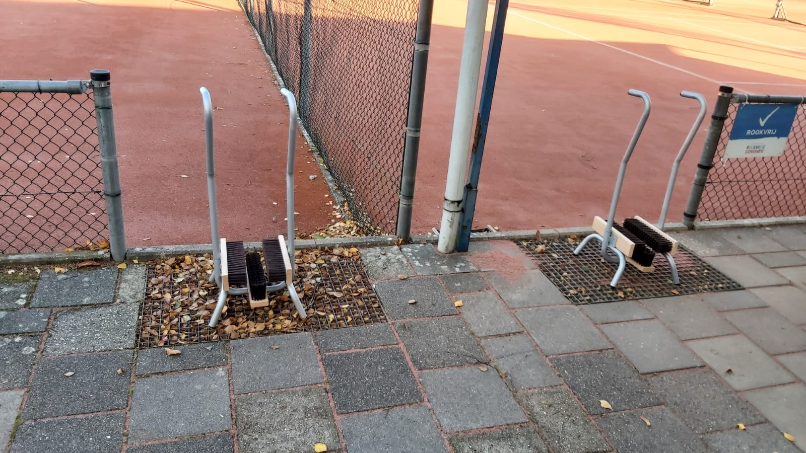 De oude "vegermatjes" waren echt wel aan vervanging toe. De vegers die nu sinds een paar weken dienst doen kunnen zeker wel weer een tijd mee. Vergeet dus niet bij het verlaten van de baan om je schoenen te vegen. Dat is een kleine moeite en dan blijven de korreltjes op baan. En niet op het terras, of erger nog in de kantine of op straat bij de buren!